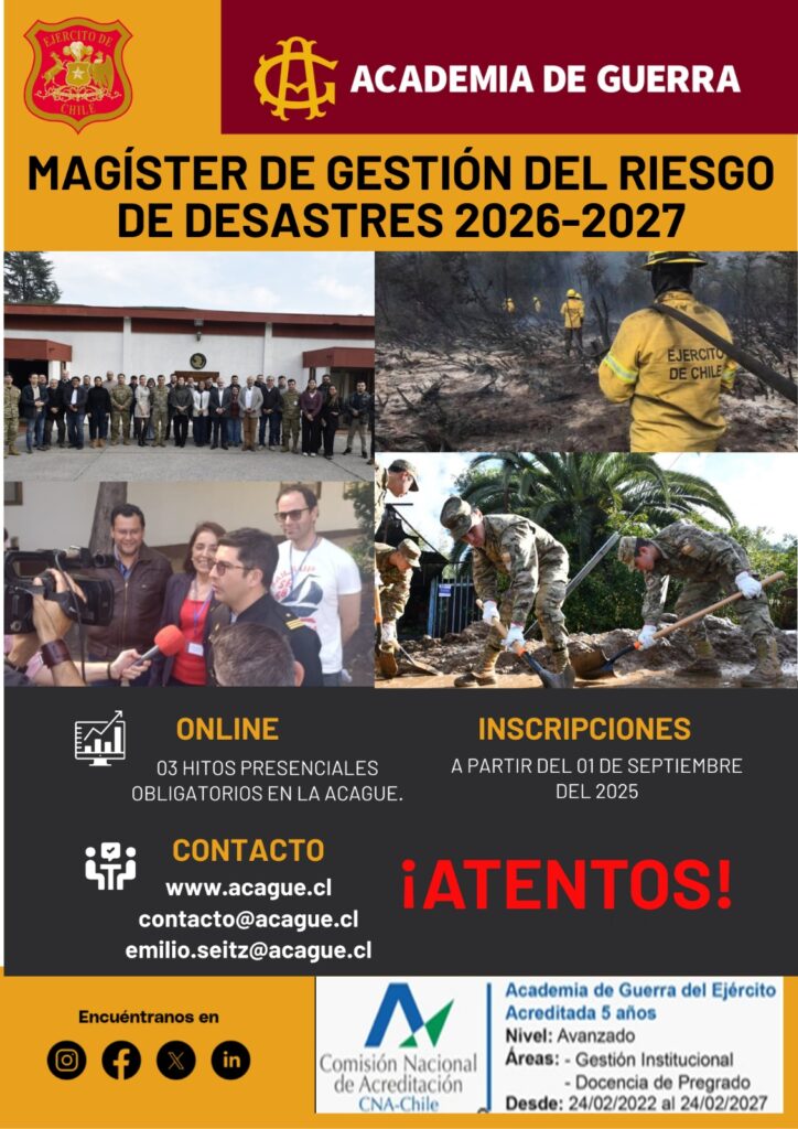 Tiene por objetivo, formar profesionales civiles y militares para desempeñarse en la dirección, asesoría o integrando equipos orientados a la Gestión del Riesgo de Desastres, capaces de liderar acciones en las diferentes fases del ciclo de riesgo; ya sea en instituciones públicas o privadas.